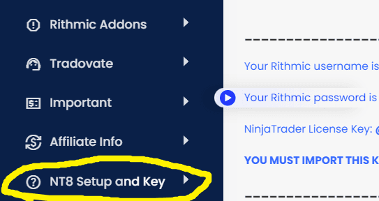 You can find your Rithmic username and password in your ATF.com account. Specifically in the NT8 Setup and Key Section.