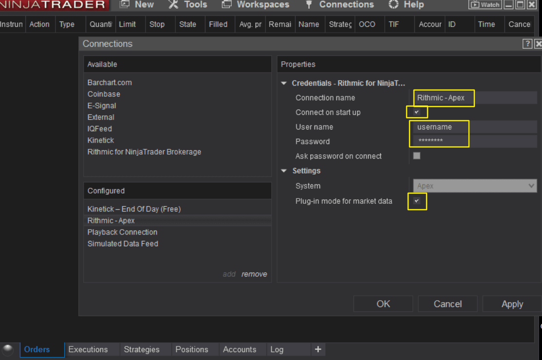 Connect on start up: [enable] *** keep in mind you have to connect to Rithmic via Rithmic Trader Pro before loading up Ninjatrader in order to connect properly.
